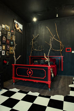 The studio features distinct areas like a Victorian-inspired living room with a curiosity cabinet, a dark forest bedroom with a canopy bed made from real branches, and a red-walled sitting area with a leather ghost figure. Many accessories were handmade or reused, adhering to a zero-waste philosophy. Though expensive, with just creative improvisation on a limited budget, Ingrida achieved her lifelong dream of an authentically gothic space that feels both cozy and unsettling.